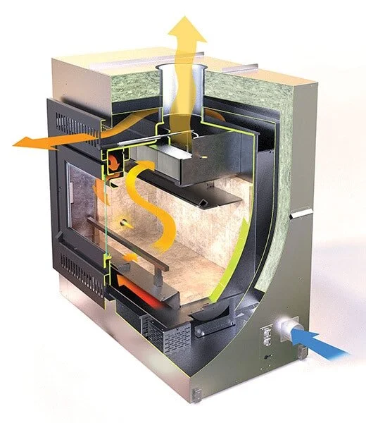 An additional boost to the primary fire is achieved by air inlets near the base of the firebox, allowing for quick and easy startup of the fire. A durable, large catalytic combustor incinerates any leftover particulates, burning almost all of the flue gases and eliminating carbon monoxide.