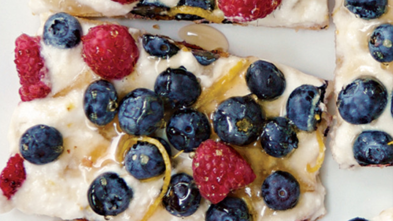 - Remove from the EGG and immediately spread it evenly with the ricotta mixture. Let your inner artist dictate how you arrange the berries over the top. Finish with a generous drizzle of honey. Slice and serve immediately.
